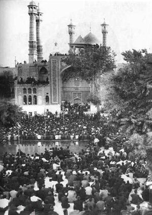 - به دنبال اعلام همهپرسی انقلاب سفید از سوی محمدرضا پهلوی و موضعگیری شدید امامخمینی علیه آن[۵۶] که تعطیلی بازار قم به پیروی از بازار تهران، همچنین مراجعه مردم و طلاب به منازل مراجع دینی را در پی داشت،[۵۷] نیروهای رژیم پهلوی در روز ۳/۱۱/۱۳۴۱ جمعیتی را که در میدان آستانه بودند و شعار میدادند «ما تابع قرآنیم رفراندوم نمیخواهیم»، به گلوله بستند و به مدرسه فیضیه حمله کردند و در صحن مدرسه به تیراندازی و زدن طلاب پرداختند و در و پنجرههای بعضی از حجرهها را در هم شکستند.[۵۸] امامخمینی با آگاهی از این جریان در بیانیهای که با جمله «إِنَّا لِلَّهِ وَ إِنَّا إِلَیهِ راجِعُونَ»[۵۹] آغاز میشد، با اشاره به چگونگی حمله به مردم قم و مدرسه فیضیه از مظلومیت طلاب بیپناه و مردم ستمدیده قم یاد کرد و از خداوند حفظ اسلام و استقلال مملکت را خواستار شد.[۶۰]